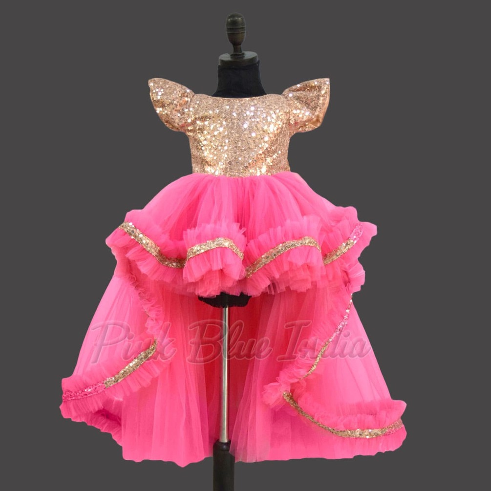 Buy Online Pink color Sequin High Low Tail Party Wear Gown for Baby Girl. Perfect Dress with Sequin Yoke for Evening Birthday Party.